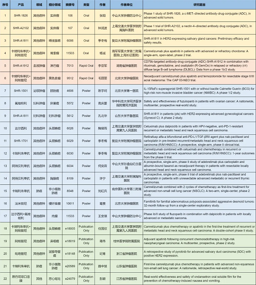 在肺癌、妇科肿瘤、淋巴瘤、膀胱癌、头颈肿瘤、黑色素瘤、肉瘤、鼻咽癌、脊索瘤、唾液腺癌、胸腺癌、硬纤维瘤、涎腺导管癌等其他多个疾病领域,卡瑞利珠单抗、阿帕替尼、阿得贝利单抗、吡咯替尼、达尔西利、氟唑帕利、法米替尼、SHR-1501、瑞拉芙普-α(SHR-1701)、SHR-1826、瑞康曲妥珠单抗(SHR-A1811)、SHR-A1912、SHR-A2102等抗肿瘤创新药相关研究一共入选了4项口头报告、2项快速口头报告、11项壁报展示和4项线上发表,彰显了z6尊龙凯时医药强劲的研发实力。此外,昂丹司琼口溶膜在防治化疗导致的恶心呕吐方面展现出了良好的疗效,本次ASCO年会有1项研究线上发表。