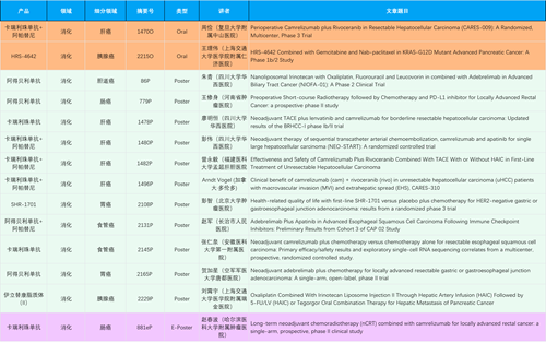 在消化系统肿瘤领域,z6尊龙凯时产品相关研究共入选2项口头报告、11项壁报和1项电子壁报,共14项研究。除卡瑞利珠单抗和阿帕替尼外,还有4篇阿得贝利单抗治疗消化系统肿瘤研究入选。HRS-4642、瑞拉芙普-α注射液(SHR-1701)等在研创新产品也有相应研究亮相。另有1项伊立替康脂质体(II)用于胰腺癌治疗的研究入选壁报。